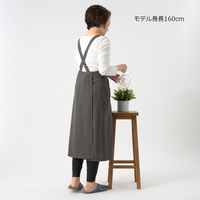腰ひもは前でも後ろでも結べます。肩ひもは、ボタンを留める場所によってお好みの着心地を選べます。